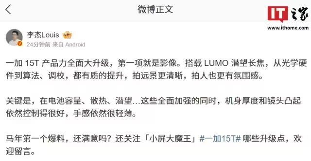 一加中国区总裁李杰开启了一加 15T 小屏手机的预热。他示意,这款新机产物力全面升级,影像方面搭载 LUMO 潜望长焦,声称从光学硬件到算法、调校,皆有质的进步。