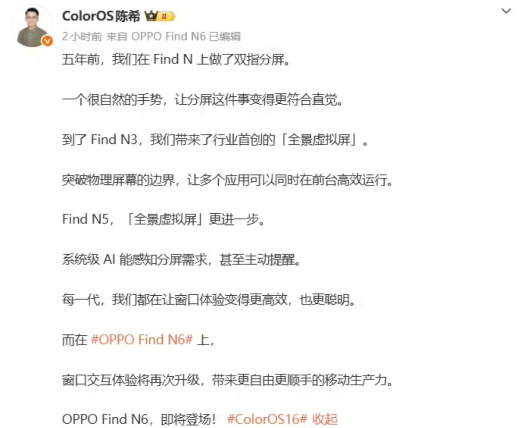 OPPO ColorOS 规划总监陈希发文,回来了 Find N 系列手机在窗口交互方面的转变,并示意,每一代,OPPO 皆在让窗口体验变得更高效,也更机灵。而在 Find N6 上,窗口交互体验将再次升级,带来更解放更顺遂的移动分娩力。